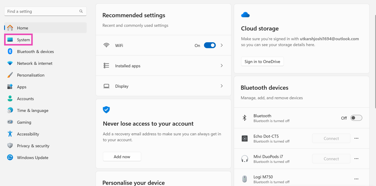 ステップ1:行きます設定に切り替えますシステムタブ。