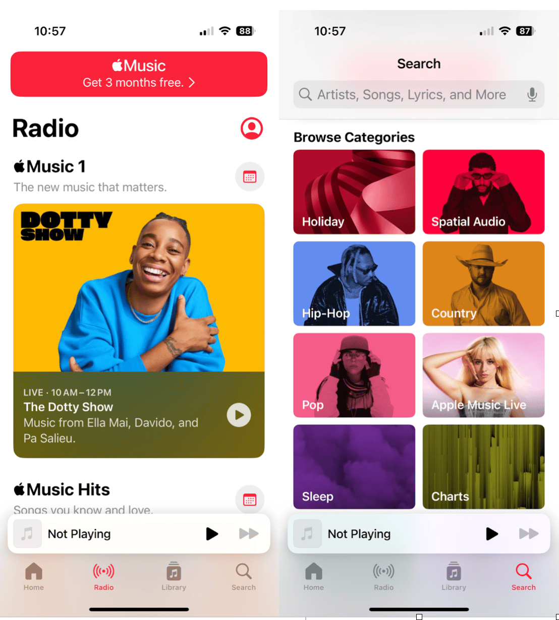 Apple Musicは、多くのiPhoneユーザーにとってデフォルトの選択肢であり、膨大な曲のライブラリへのアクセスを提供します。このアプリを使用すると、サブスクライブしたら、オフラインリスニング用の音楽をダウンロードできます。キュレーションされたプレイリストとパーソナライズされた推奨事項により、Apple Musicはビートを見逃すことはありません。
