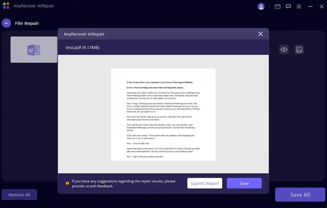 破損したドキュメントをアップロードして、オンラインFile.repairを使用して、回復可能なテキストを抽出します。これらの簡単な手順を参照してください: