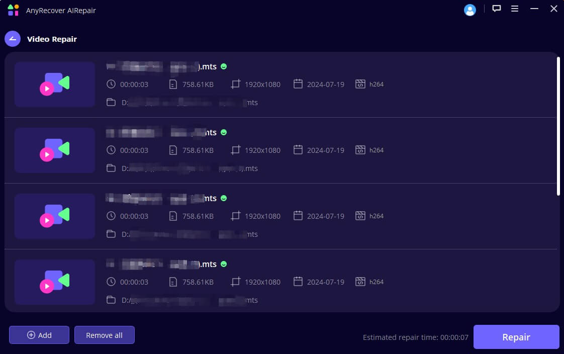 Any Recover Airepairは、できる包括的なビデオ修理ソリューションですビデオの破損のレベルを修正しますそしてビデオの品質を向上させます再生エラー、コードの壊れたビデオの壊れたビデオなどを含む。高度なアルゴリズムとユーザーフレンドリーなインターフェイスを備えているため、いくつかの簡単なクリックで破損した録音を修復できます。