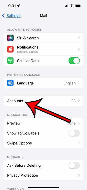iPhoneにメールアカウントが既にある場合は、ここにアカウントの数が表示されます。