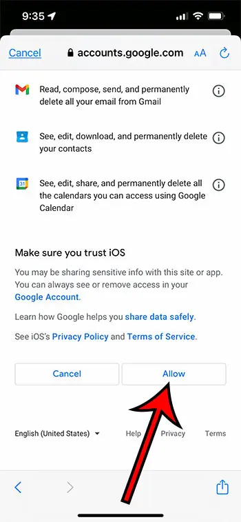 ステップ7:[iOSにアカウントにアクセスするようにすることを確認する]をタップします。