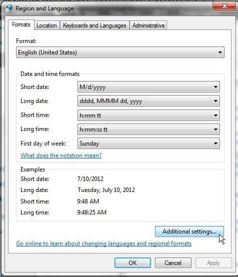 これは同じメニューで実行され、Windows 7のデフォルトのデリミッターまたはリストセパレーターを変更することもできます。
