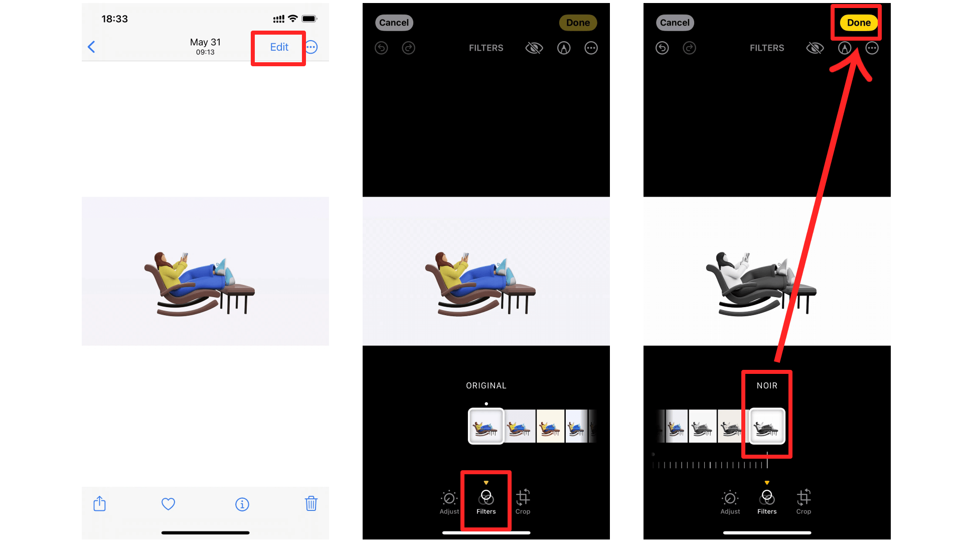 選択する「フィルター「、「右にスライドして」ノワール"フィルター、クリック終わり」この画像を保存し、写真をGrayscaleに正常に変換するための右上隅で。