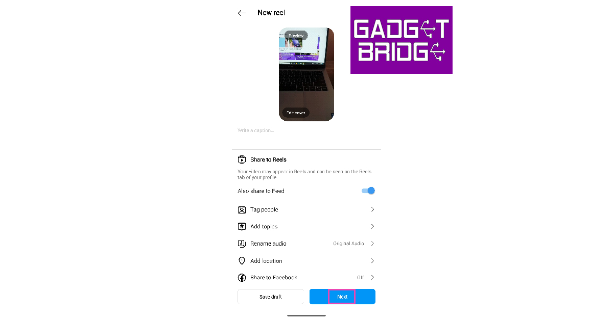 ステップ6:書くキャプションそして追加しますサムネイルリールのために。あなたもできますタグ他の人と他の人をコントロールします可視性設定このページから。打つ次。