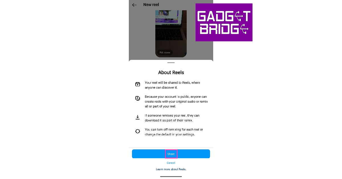 ステップ6:Aを追加しますキャプションリールを編集しますカバー。打つ共有。