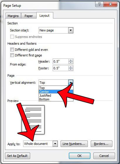 これを適用する方法には2つのオプションがあります。最初のオプションは、ドキュメント全体のテキストを垂直に集中することです。 2番目のオプションは、この時点からテキストを垂直に中央に配置することです。