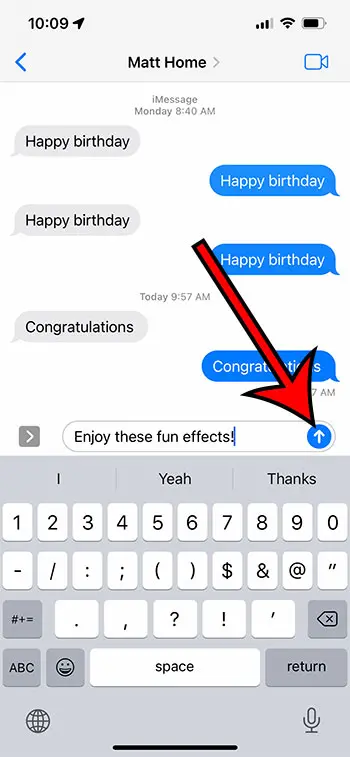 「おめでとう」という言葉を送信して、iPhone 13のimessageで紙吹雪を送信するか、何かを入力して送信ボタンをタップして保持し、[紙吹雪で送信]オプションを取得するために3回左にスワイプします。その後、送信矢印をタップできます。