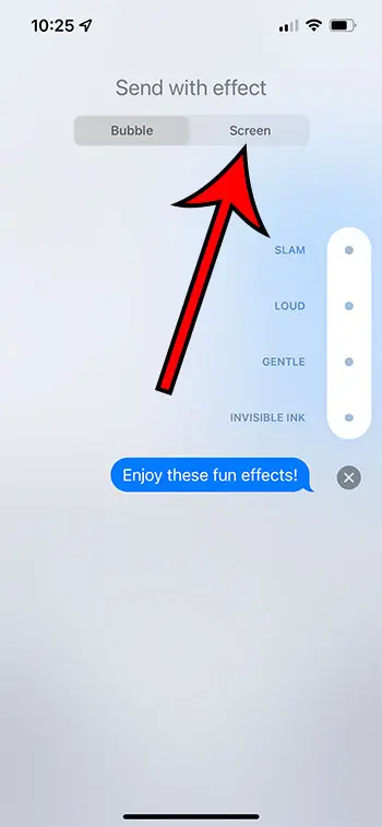 Imessageアプリを使用して、別のiPhoneユーザーに楽しいエフェクトを送信する他の方法があります。送信ボタンをタップするのではなく、メッセージを入力した後に[送信ボタンも呼ばれます)をタップして押し続けると、「効果を持つ送信」オプションのセットが追加されます。バブルタブと画面タブがあり、その間に選択できます。これらには以下が含まれます: