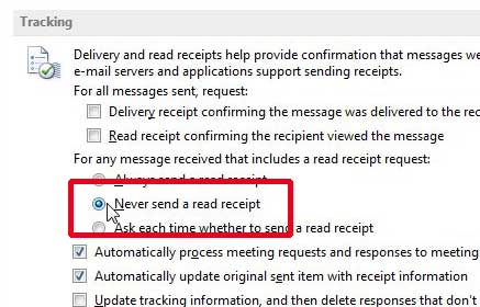 ステップ5:追跡セクションまでスクロールしてから、左側のオプションをクリックします読み取り領収書を送信しないでください。