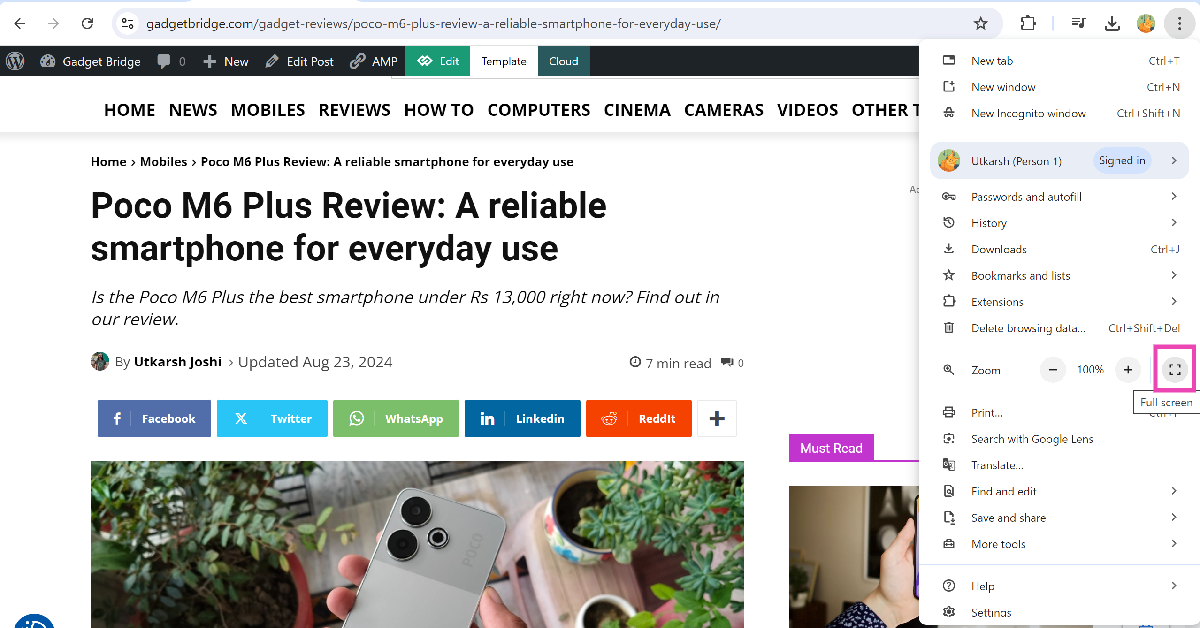 また、フルスクリーンになると、Webページ上のテキストが拡大しないことも知っておく必要があります。画面上の単語を読むのが難しい場合は、Chromeのズーム機能を使用する方が良いでしょう。アクセスするには、画面の右上隅にある楕円をクリックし、「Zoom」カテゴリのプラスアイコンを押します。