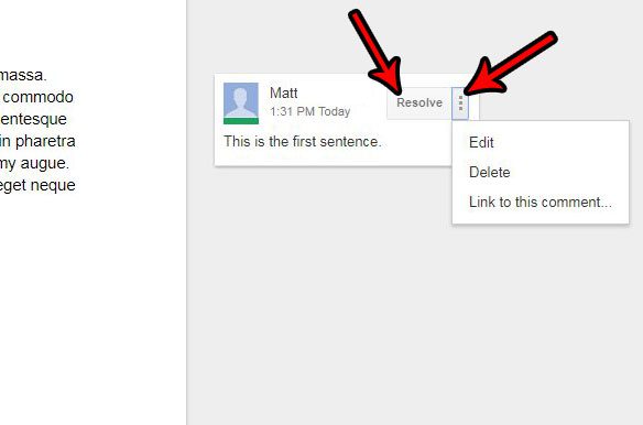 コメントがドキュメントにあると、解決するコメントを却下するボタン、または3つのドットでアイコンをクリックすることができます編集、消去、 またはコメントへのリンク。