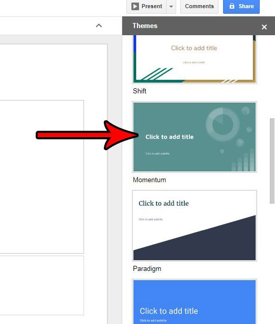 ステップ3:ウィンドウの右側にある列のテーマをスクロールし、使用するものをクリックします。そのテーマはプレゼンテーションに適用されます。