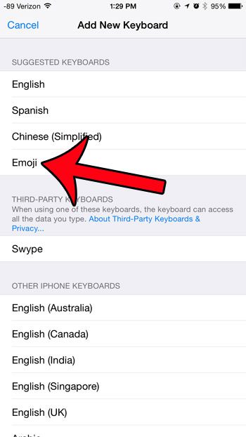 ステップ6:選択します絵文字オプション。この画面の上部に絵文字オプションが表示されない場合は、下にスクロールする必要がある場合があることに注意してください。