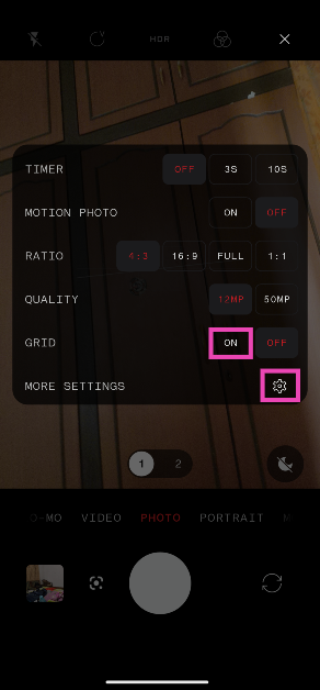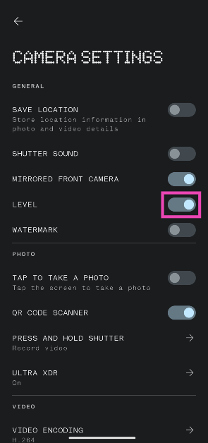 カメラアプリを開き、画面の右上隅にあるEllipses/Hamburgerメニューをタップし、グリッドラインのスイッチをオンにし、「その他の設定」をタップし、「レベル」のトグルスイッチをオンにします。