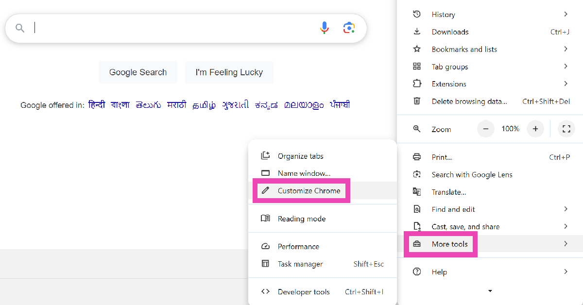 ステップ2:カーソルをに移動しますその他のツール選択しますChromeをカスタマイズします。