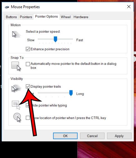 ステップ7:左のボックスを確認またはチェックしてくださいポインタートレイルを表示します、次にクリックします適用するボタン、続いてわかりましたボタン。