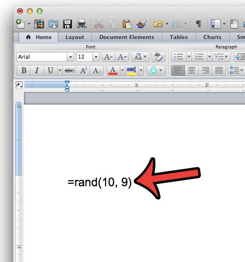 ステップ2:ドキュメント内部をクリックして、入力します= rand(x、x)。入っています= rand(10、9)これにより、段落ごとに9文の10段落が作成されます。最初の段落を置き換えることで、段落の数を指定できますxその数のフォーミュラで、2番目の文を置き換えて文の数を指定しますx式で。プレス入力サンプルテキストの作成が完了したら、キーボードに。