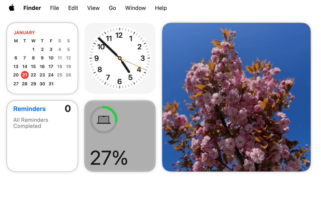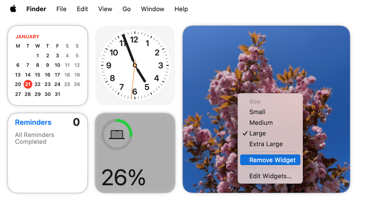 ウィジェットは、通知センターに配置されているミニアプリのようなもの、またはデスクトップおよびライブ情報を表示して選択した場合のようなものです。それらは、他の多くのことの中でも、天気、株価、または現在Apple Musicで再生されている曲を示すために使用できます。ウィジェットはインタラクティブにすることができます。たとえば、Remindersウィジェットで完了したアイテムをマークできます。サードパーティのアプリには、独自のウィジェットを持つこともできます。 iPhoneを持っていて、同じApple IDを使用している場合は、MacにiPhoneアプリからウィジェットを表示することもできます。通常、ウィジェットには、サイズの3つのオプションと、表示される情報の量があります。表示するものを選択できます。