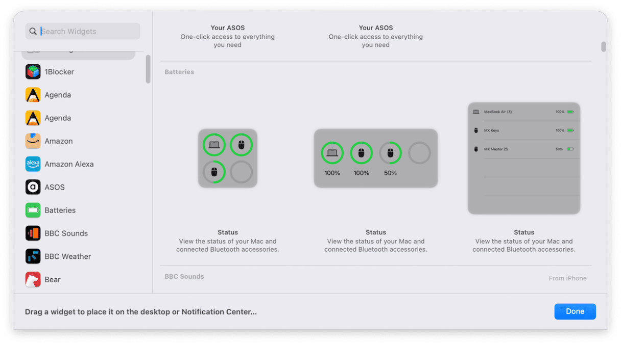 - デスクトップにウィジェットを追加するには、デスクトップにドラッグしてリリースします。通知センターに追加するには、通知センターにドラッグしてリリースします。