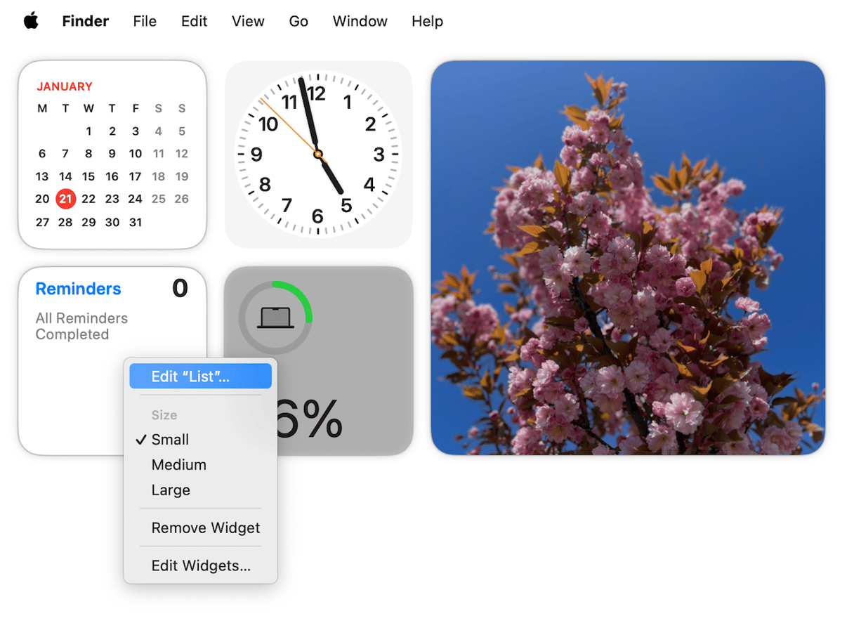 ほとんどのウィジェットでは、表示する情報を選択できます。たとえば、リマインダーを使用すると、表示するリマインダーリストを選択できます。また、カレンダーを表示するカレンダーを選択できます。その選択を行うには、デスクトップ上にある場合はウィジェットを右クリックまたはコントロールし、[ウィジェット名]の編集を選択します。その後、利用可能なオプションが表示されます。 1つを選択して、[完了]をクリックします。ウィジェットが通知センターにある場合、最初に通知センターを表示する必要があります。