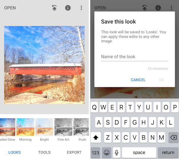 - ポップアップ画面が表示され、「この外観を保存する」ことを奨励します。フィルターに名前を付け、[OK]をタップして後で保存します。