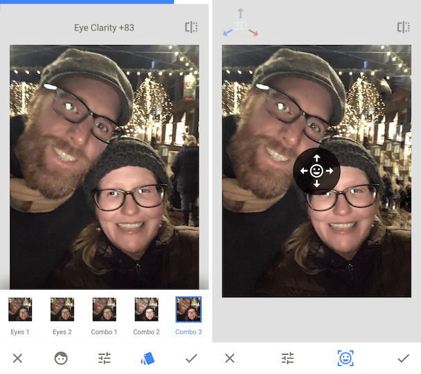 - ヘッドポーズ:このツールは、3Dテクノロジーを使用して、頭の傾きを変更して、よりお世辞のイメージに変えます。画面に指をドラッグして、頭の位置を変更します。また、スライダーをタップして、生徒のサイズ、笑顔、焦点距離を増やしたり減らしたりすることもできます。これは微妙な変更を加えるための優れたツールですが、注意してください。大きな変更を加えると、ポートレートが不自然に見えます。