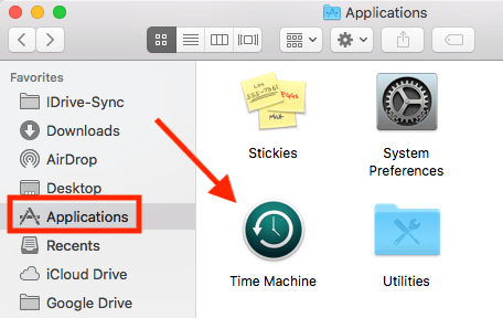 写真、ビデオ、ドキュメント、アプリケーション、システムファイル、アカウント、設定、メッセージ、名前の名前。それらはすべて、タイムマシンでバックアップできます。その後、タイムマシンのスナップショットからデータを復元できます。そうするために、最初に開いてくださいファインダ、それからアプリケーション、クリックしてくださいタイムマシン続行する。