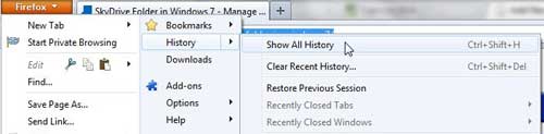 ステップ2:クリックしますFirefoxウィンドウの左上隅にあるタブをクリックします歴史、クリックしますすべての歴史を示します。