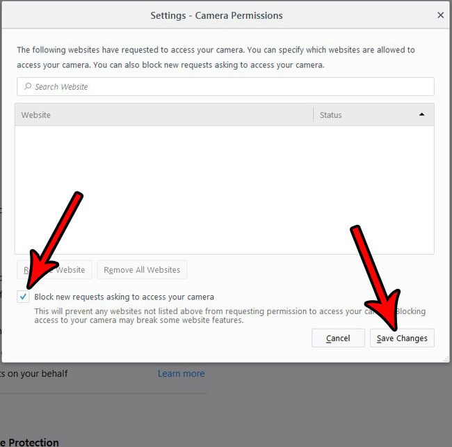 ステップ6:左側のボックスを確認しますカメラにアクセスするように要求する新しいリクエストをブロックします、次にクリックします変更を保存しますボタン。