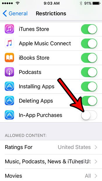 ステップ7:下にスクロールして、ボタンをタップしますアプリ内購入デバイスでそれらをブロックします。下の写真で、iPhone SEでアプリ内購入をオフにしました。