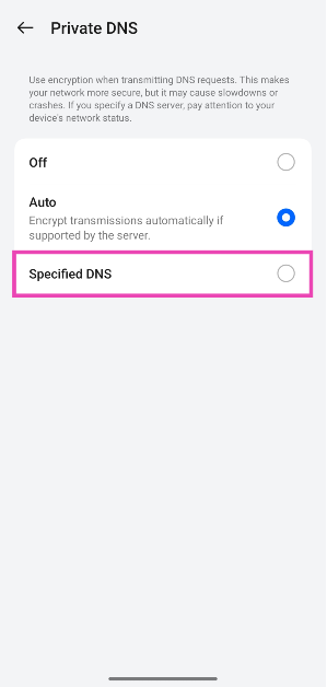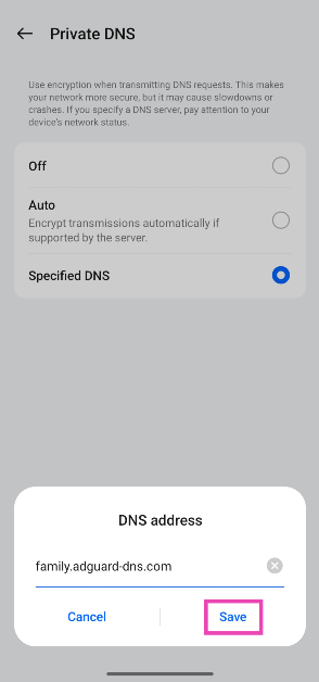 ステップ4:を入力しますホスト名DNSプロバイダーの。例えば、dns.adguard-dns.comまたはfamily.adguard-dns.com。