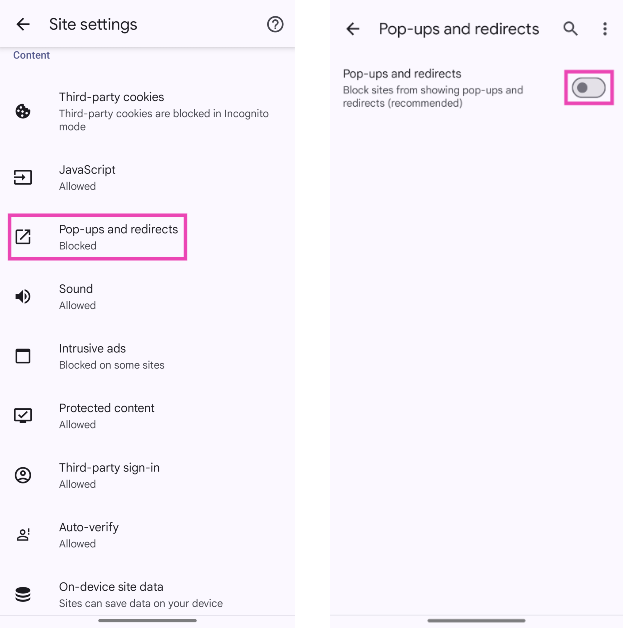 ステップ4:選択しますポップアップとリダイレクトトグルスイッチをオフにします。