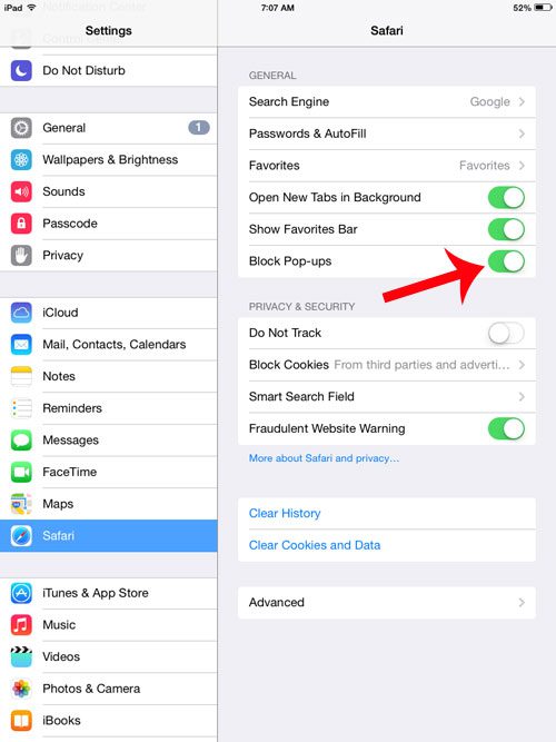 ステップ3:右側のボタンをタッチしますブロックポップアップ。ボタンの周りに緑のシェーディングがあるときに、サファリブラウザがポップアップをブロックするようにセットアップされていることがわかります。
