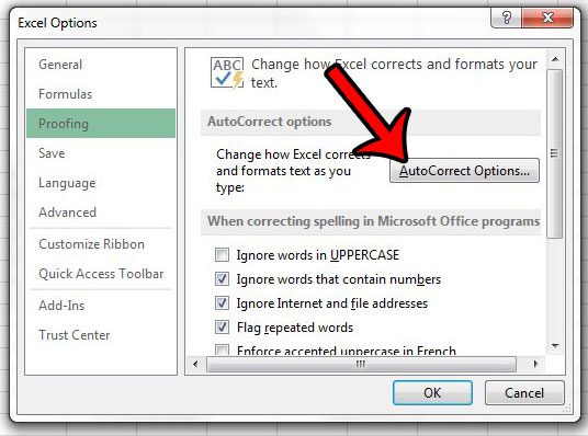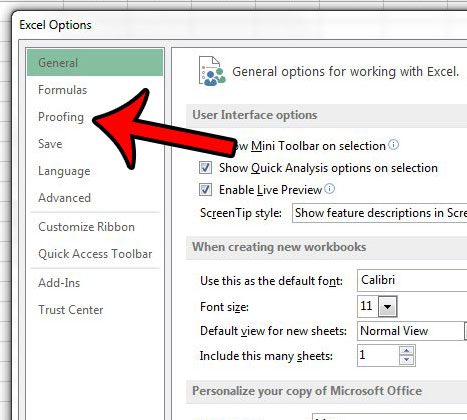ステップ4:クリックします校正の左側のタブExcelオプションウィンドウ。