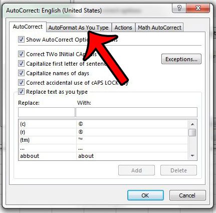 ステップ6:クリックします入力するときにオートフォーマットタブ。