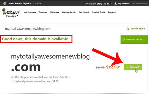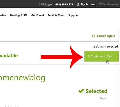 ブログの潜在的な名前を検索フィールドに入力し、クリックします検索利用可能なものを見つけるまで。使用可能なドメイン名ができたら、グリーンをクリックします選択しますカートに追加するボタン。
