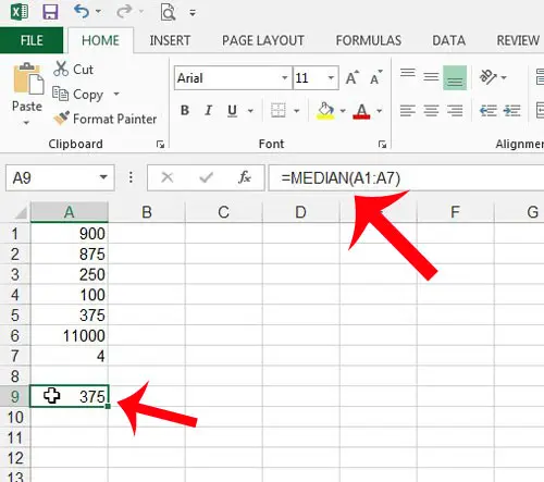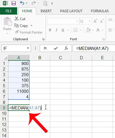 以下の私の例の画像では、式はそうです=中央値(A1:A7)。その後、押すことができます入力キーボードで式を計算します。