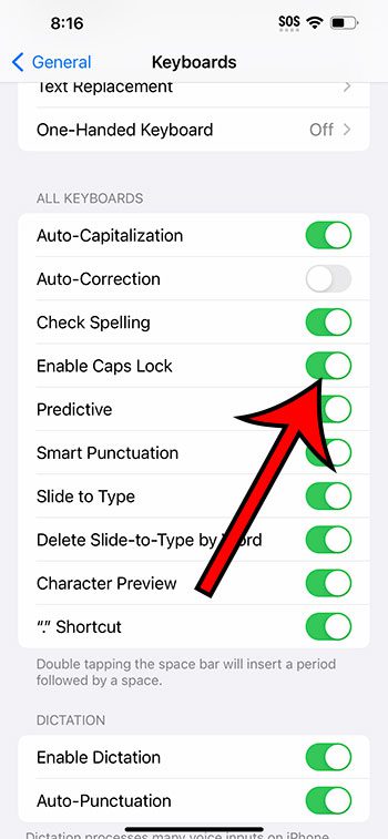 iPhone 14のキャップロックを使用して使用できます設定>一般>キーボード>その後、電源を入れますキャップロックを有効にします。次に、キーボードのシフトキーをダブルタップしてアクティブにする必要があります。