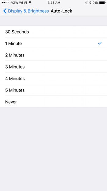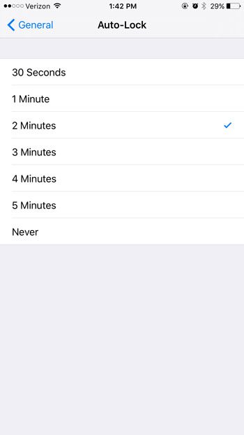 ステップ4:新しいオートロック時間を選択します。これは、iPhoneの画面が自動的にロックされるその後の非活動期間であることに注意してください。選択した場合一度もないオプションで、iPhone画面は、デバイスの側面または上部の電源ボタンを押して、画面を手動でロックするまで続きます。