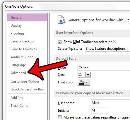 ステップ4:クリックします高度なのタブOneNoteオプションウィンドウ。
