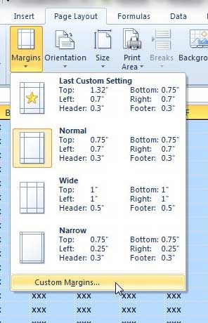 ステップ4:クリックしますカスタムマージンメニューの下部にあるオプションを開きますページのセットアップダイアログボックス。
