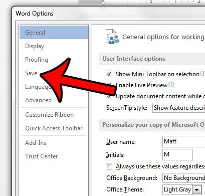 ステップ4:クリックします保存の左側の列のタブ単語オプション。