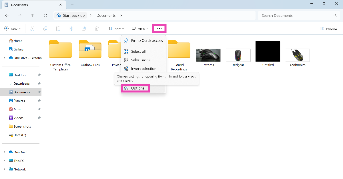 フォルダーを開き、[表示]をクリックし、リストからオプションを選択します。または、空のスポットを右クリックして、カーソルを「表示」に移動し、オプションを選択します。