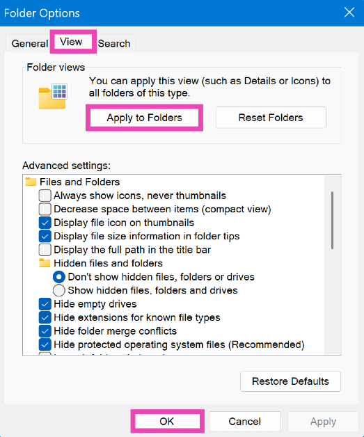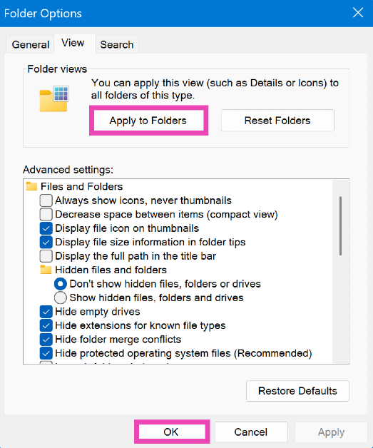 ステップ5:に行きますビュータブとクリックしますフォルダに適用します。