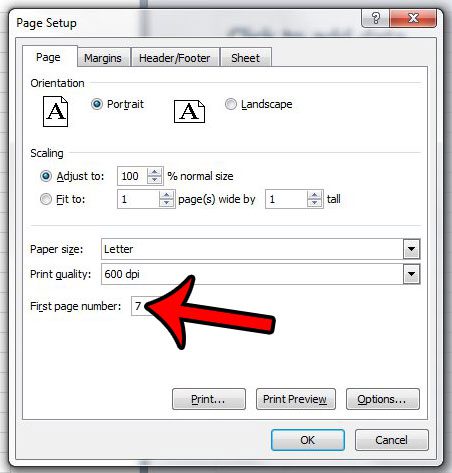 - 内部をクリックします最初のページ番号フィールド、現在の値を削除してから、開始ページ番号として使用する番号を入力します。クリックしますわかりました終了したらボタン。