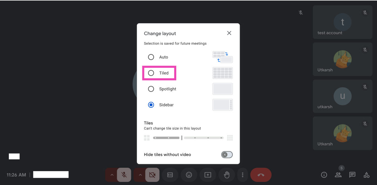Tiled:これは、Google Meetで最も人気のあるレイアウトオプションの1つです。すべての参加者のビデオフィード用の小さなセルを作成し、画面にそれらを一緒に表示します。これは、すべての参加者を一度に表示するための理想的なレイアウトです。メイン画面で最大49人の参加者を同時に表示できます。