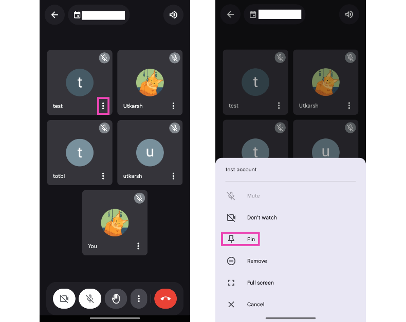 - 参加者をピン留めします画面の上部に、タイルの楕円を叩きます「ピン」を選択します。これにより、セルが拡大し、画面の上部に固定されます。