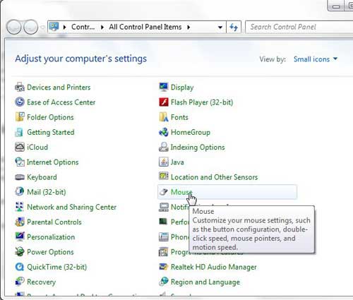ステップ1:デフォルトのマウス設定を使用するようにWindows 7が構成されたので、に戻りますコントロールパネル。