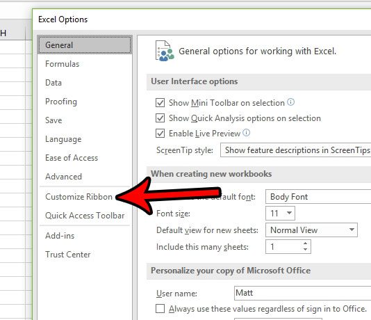 ステップ4:クリックしますリボンをカスタマイズしますの左列のオプションExcelオプションウィンドウ。